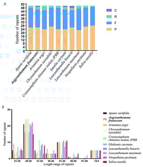 Long repetitive sequences and the SSR locus of the chloroplast genomes of A. frutescens and nine other species in the tribe of Anthemideae were analyzed. A total of 250 repeats were detected among these ten species, and F and P repeats were more abundant than C and R repeats. The total number and proportion of repeat types in 10 species showed similarity pattern, suggesting a similar evolutionary history and close relationship among species in the tribe of Anthemideae (Figure 2A). The most prevalent repeat units were in 26–30 bp, followed by 41–45 bp, while the length in 51–59 bp occurred less frequently (Figure 2B). Of which, twenty forward repeats, twenty-six palindromic repeats, three reverse repeats, and one complementary repeat were found in the A. frutescens chloroplast genome that was more similar to I. carinata. In A. frutescens, the longest forward repeat was 60 bp in length and was located in the IR region. In the LSC, IR, and SSC regions, 26, 8, and 15 repeats were presented, respectively.