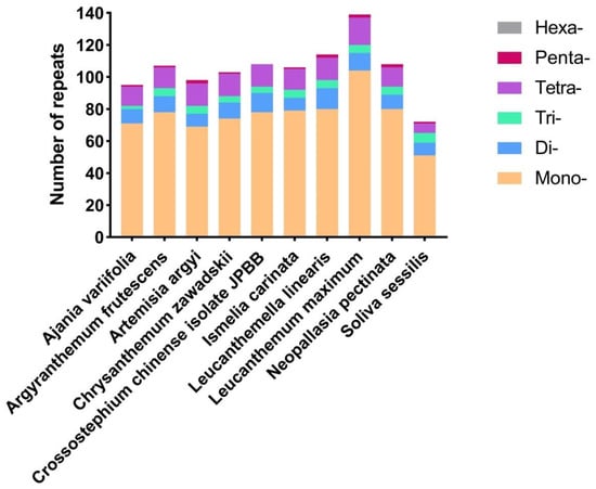 Simple-sequence repeats (SSRs) in ten different Anthemideae chloroplast genomes. Mono- represents mononucleotide SSRs, and Di- represents dinucleotide SSRs, etc. The vertical axis represents the number of different SSR types.