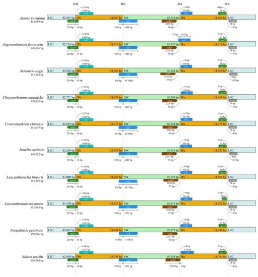 The junctions of IR/SC comparison among 10 species in the tribe of Anthemideae. Arrows indicated the distance of the gene to the junctions, and the I-shaped line represented the length of the gene on either side of the junctions.