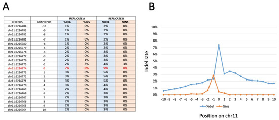 Representative indel frequency and positioning around the β039 CRISPR-Cas9 editing target site, obtained with amplicon sequencing of β039 ErPCs treated with the CRISPR-Cas9 system. Panel (A) shows the indel frequency values for the amplicon replicates analyzed. In particular, the ten positions upstream and downstream from position chr11: 5226.774 (β039 target site indicated in red) were analyzed. The data obtained are reported in panel (B) in which the percentage of deletion (blue line) and insertion (orange line) is graphically reported as a function of each nucleotide position investigated. Similar results were obtained with WGS sequencing (Figure S7).