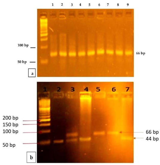 The mutation was the MTRR A66G detected, using the RFLP (Restriction Fragment Length Polymorphism Method). PCR amplification was performed using specific forward and reverse published primers [27]. Next, 5 μL of the reaction product was electrophoresed on a 2% iNtRON agarose gel previously stained with EtBr for 45 min at 89 V and 25 m. A 50 bp biomarker ladder was added to an estimated 66-bp of amplicon and visualized on the gel documentation system previously mentioned. The amplicon (66-bp) was digested overnight at a temperature of 37 °C with the restriction enzyme Nde1 (New England BioLabs, Inc., Ipswich, MA, USA). The mixture reaction produced digested products that are visualized under electrophoresis on a 4% of iNtRON agarose gel with EtBr, in addition to a 50 bp ladder marker (iNtRON BIOTECHNOLOGY, Inc., Gyeonggi-do, Korea). The G allele produced a 66-bp band, and the A allele produced 44 and 22 bp fragments (Figure 1a,b). The sample size was calculated with a 1:2 ratio for the cases and controls and the difference in the proportions of polymorphism of MTRR A66G between the study groups.