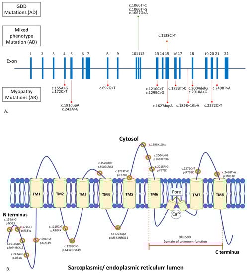 ANO5 contains 22 exons (Figure 1A) [23]. ANO5 muscle diseases are due to biallelic, loss-of-function mutations in ANO5, while GDD is a result of monoallelic, gain-of-function ANO5 mutations. [2,12,24]. There are over 120 ANO5 mutations linked to human diseases (https://databases.lovd.nl/shared/genes/ANO5, accessed on 1 July 2022). These mutations spread throughout the entire gene. Approximately 20% of the mutations are missense variants, and 80% are of other variant types, including nonsense, insertion, deletion, splice-site, and silent variants [12,15,25]. The most common ANO5 mutations are c.191dupA (p.N64KfsX15) in exon 5, followed by c.1898 + 1G > A in intron 17, c.2272C > T (p.Arg758Cys) in exon 20, and c.692G > T (p.Gly231Val) in exon 8, respectively (https://databases.lovd.nl/shared/genes/ANO5, accessed on 1 July 2022). The truncating c.191dupA mutation is a founder mutation in the northern European populations [9]. Homozygosity of the c.191dupA mutation is common in England, Germany, and Denmark, ranging from 45 to 75% [9,10]. In France and the Netherlands, about 16–17% of patients carried the homozygous c.191dupA mutation [5,13]. The c.2272C > T mutation is common in Finland. Homozygosity of the c.2272C > T mutation was found in 36% of Finnish patients [11]. None of these frequent pathogenic variants were found in reported Asian patients [17,18,19,22]. There is no established genotype–phenotype correlation in anoctaminopathy-5. For example, patients carrying the homozygous c.191dupA mutation may express LGMDR12, MMD3, pseudometabolic, or asymptomatic hyperCKemia phenotype. [5,11,12,15,26]. Interfamilial and intrafamilial variabilities in clinical presentation and disease progression have also been reported [15,27].