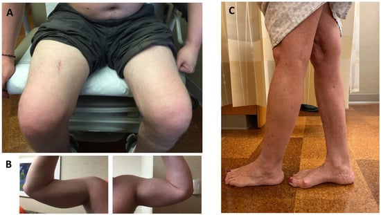 Patients typically develop pelvic girdle weakness followed by an involvement of the shoulder girdle musculature. Asymmetric weakness and atrophy are common (up to 90% of patients), leading to a classic feature of asymmetrical quadriceps femoris and biceps brachii atrophy (Figure 2A,B) [9,13]. Despite LGMDR12 being considered a proximal myopathy, calf atrophy or pseudohypertrophy is a common finding on the exam [2,9,14,19,26,27,41,50]. Gastrocsoleus weakness may occur, but to a lesser degree compared to MMD3 patients; however, it can become more evident in the advanced stage of LGMDR12. Tibialis anterior involvement leading to foot drop is uncommon [21]. Axial muscle weakness has been reported in up to 36% (9/25) of patients [4,12,26], and rarely it could be the sole manifestation of the disease [26]. Mild dysphagia has been reported in 16–46% of patients [10,26]. About 20–35% of patients may have scapular winging. Mild joint contractures were observed in 10–38% of patients [9,10,12].