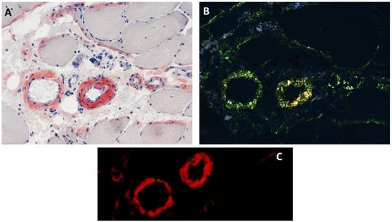 Congophilic deposits within intramuscular blood vessels and/or connective tissue elements (endomysium or perimysium) were reported in 53% (8/15) of patients with ANO5 muscle disease (Figure 3), who had no evidence of systemic amyloidosis [6]. Although there is no genotype–phenotype correlation regarding the interstitial amyloid deposition in anoctaminopathy-5, intramuscular interstitial amyloidosis has been reported in the patients homozygous for the c.191dupA mutation [6]. Therefore, the frequency of intramuscular interstitial amyloidosis could be higher in an anoctaminopathy-5 cohort with a high percentage of c.191dupA homozygosity. This interstitial amyloidosis observed in ANO5 muscular dystrophies is similar to what is observed in some patients with dysferlinopathy [3,4,6,20,22,25,49]. Isolated amyloid myopathies (IAMs) refer to a group of genetically heterogenous myopathies featuring amyloid deposits restricted to skeletal muscles, without any evidence of systemic amyloid deposition. ANO5 muscular dystrophies are the most common cause of IAMs, accounting for 57% (8/14) of patients, followed by dysferlinopathy (2/14 or 14%) [56,62]. The mass-spectrometry-based proteomic analysis of intramuscular congophilic deposits obtained from ANO5 muscular dystrophy patients confirmed the presence of amyloid chaperone proteins (e.g., serum amyloid P and/or apolipoprotein E) but failed to identify ANO5 within the deposits [4]. The clinical significance of localized amyloidosis affecting skeletal muscle in anoctaminopathy-5 patients remains unknown. In a cohort of 15 patients with ANO5 muscular dystrophies, there was no significant difference of either muscle or cardiac phenotypes between patients with, and without, interstitial amyloidosis [6].