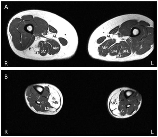 T1-weighted lower limb MRI in a patient with LGMDR12, calf atrophy and longstanding history of exercise intolerance and rhabdomyolysis showing asymmetrical fatty replacement of predominantly posterior lower limb compartment muscles, including bilateral adductor longus, long head of right biceps femoris, and bilateral semitendinosus (A) and bilateral medial gastrocnemius and parts of lateral gastrocnemius (B). AL—adductor longus, AM—adductor magnus, SM—semimembranosus, ST—semitendinosus, BFL—long head of biceps femoris, MG—medial gastrocnemius, LG—lateral gastrocnemius.