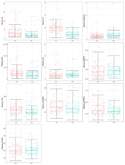 Boxplots for the selected 4 serum and 6 plasma biomarkers between 79 ADs and 65 NCs (red for ADs; cyan for NCs).