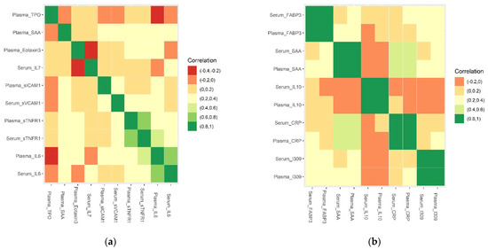 Correlation of selected 10 serum and 10 plasma biomarker combinations (a) selected 10 serum and plasma biomarkers (b) unselected 5 pairs of serum and plasma biomarkers that were highly correlated.