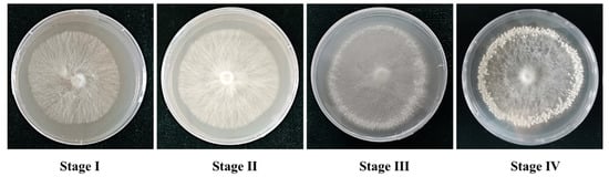 The developmental process of primordium formation of P. tuoliensis includes four major stages (Figure 1): mycelia growth (Stage I), cold stimulation of Stage I mycelia (Stage II), induction of primordium formation (Stage III), and primordium (Stage IV). The vegetative growth development occurs in Stage I and Stage II, the transition of vegetative to reproductive growth occurs in Stage III, and the reproductive growth development occurs in Stage IV. In the absence of cold stimulation and light, the transition from vegetative growth to reproductive growth rarely occurs. The culture conditions of P. tuoliensis were as follows: mycelia were first grown at 25 °C in cultivation dishes for up to 7 days in the dark (Stage I), then cold stimulation of mycelia at 4 °C for 3 days without light was carried out (Stage II). Then, the mycelia were grown at 16 °C in light 12 h/day for 7 days (Stage III). The mycelia were then incubated at 16 °C in light 12 h/day for another 7 days (Stage IV). The mycelia turned into primordia in Stage IV. The environmental conditions required for the formation of the primordium had previously been studied, but the molecular mechanism remained unknown. To investigate the molecular basis of primordium formation, mycelia and primordia of four stages were collected for further analysis.