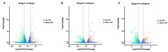 Volcano plots showing the expression level of each unigene. Limits defined by p-value ≤ 0.05 and |log2 ratio| ≥ 1. Red points represent upregulated genes; blue points represent downregulated genes. (A) Volcano plots showing the expression level of each unigene of Stage II compared to Stage I. (B) Volcano plots showing the expression level of each unigene of Stage III compared to Stage II. (C) Volcano plots showing the expression level of each unigene of Stage IV compared to Stage III.