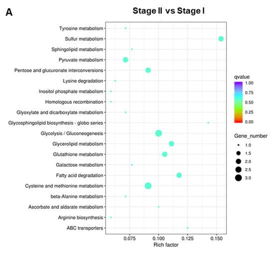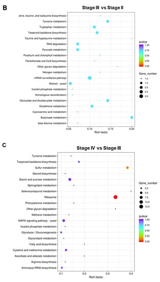 To better understand the functions and interactions of these DEGs, KEGG pathway enrichment was also conducted. In the Stage II:Stage I comparison, DEGs were enriched in 39 pathways (Table S13). The top 20 KEGG pathways are shown in Figure 7A. In the Stage III:Stage II comparison, DEGs were enriched in 43 pathways (Table S14). The top 20 KEGG pathways are shown in Figure 7B. In the Stage IV:Stage III comparison, DEGs were enriched in 61 pathways (Table S15). The top 20 KEGG pathways are shown in Figure 7C. DEGs were enriched in “Glycolysis/Gluconeogenesis”, “Cysteine and methionine metabolism”, “mRNA surveillance pathway”, and “Ribosomes”.