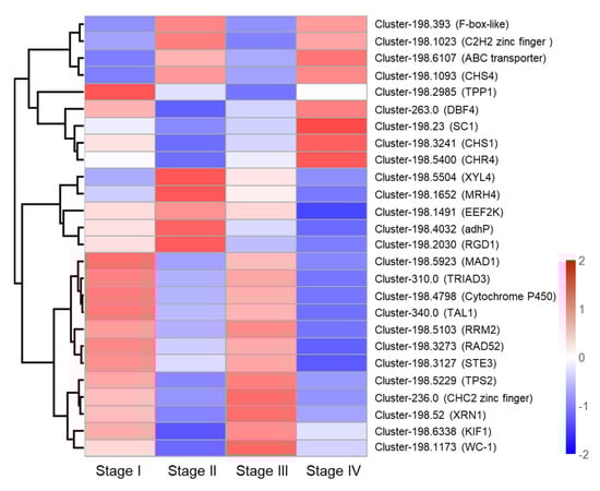 To identify genes involved in primordium formation, we analyzed 26 DEGs, which were communally altered in all stages. The 26 DEGs were selected for heat map analysis (Figure 8). No gene was continuously upregulated in these four stages. Overall, these DEGs were mainly involved in energy metabolism, protein synthesis, hormone synthesis, and lipid metabolism, demonstrating that primordium formation is a complex process which requires the participation of a variety of regulatory mechanisms. In addition, primordium formation may need ABC transporters. ABC transporters, as one of the largest transporters, can carry out ATP-dependent efflux of substrates []. The ABC transport gene (Cluster-198.6107) was significantly upregulated in Stage IV. Post-modification enzymes may play an important role in light response. The expression of Cluster-198.4798 encoding Cytochrome P450 monooxygenase was found to be significantly upregulated in Stage III. CHC2 zinc finger TF (Cluster-236.0) may negatively regulate the response to cold stress, and was found to be significantly downregulated in Stage II.