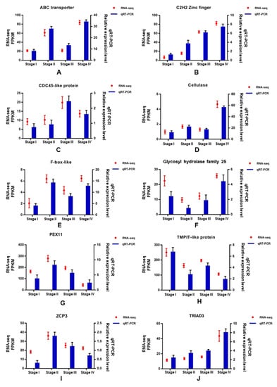 To verify the accuracy of transcriptome sequence data, 10 unigenes were randomly selected for quantitative RT-PCR (qRT-PCR), including ABC transporter (Cluster-198.6107), C2H2 Zinc finger (Cluster-198.616), CDC45-like protein (Cluster-198.5286), cellulase (Cluster-198.720), F-box-like (Cluster-198.215), Glycosyl hydrolase family 25 (Cluster-198.6122), PEX11 (Cluster-198.3467), TMPIT-like protein (Cluster-198.3145), transcription factor ZPC3 (Cluster-198.6036), and TRIAD3 (Cluster-198.1396). As shown in Figure 9, the trend of expression changes of these selected genes based on qRT-PCR was similar to those detected by the RNA-seq method, suggesting that the transcriptome data were reliable.