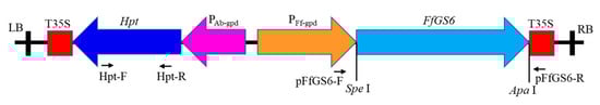 Schematic diagram of pBHg-FfGS6-OE recombinant plasmid T-DNA region. Hpt-F/Hpt-R, resistance gene amplification primer sites; pFfGS6-F/pFfGS6-R, target gene amplification primer sites; Spe I and Apa I, restriction sites.