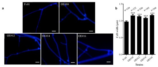 Long et al. identified that FfGS6 is a gene encoding the β-1,6-glucan of F. filiformis, which may be involved in the synthesis of cell walls [22]. To further clarify the role of FfGS6 in cell morphogenesis, we adopted a fluorescent whitening agent to stain the mycelial cell wall, followed by microscopic observation. As depicted in Figure 3a, the four transformants and the wild-type strain Fv01 showed abundant clamp connection. The fluorescent whitening agent could effectively bind to the cell wall, through which the cells could be visualized in blue under ultraviolet excitation light. Accordingly, staining was observed in the septate mycelium with clamp connections to be significantly stronger than that in other areas. The cell width of the mycelial around the clamp connection was further measured, and the results are outlined in Figure 3b. The cell widths at the septate membrane of the transformants OE#10, OE#12, OE#14, and OE#16 were noticeably increased compared to that of Fv01. Combined with the potential function of FfGS6 in the synthesis of cell walls, we speculate that the increase in cell wall thickness may be one of the reasons for the widening of the transformants cells.