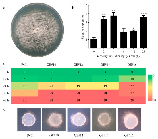 The expression pattern of F. filiformis FfGS6 in response to injury stress and mycelial repairability of its overexpression transformants. (a) F. filiformis Fv01 mycelial injury stress induction; (b) FfGS6 gene expression at different recovery time points (0, 2, 4, 6, 12, and 24 h) after Fv01 mycelial injury induction. Asterisks represent significant differences versus Fv01 (t-test, n = 3; *, p < 0.05; **, p < 0.01; ***, p < 0.001). (c) Recovery ability assessment within 48 h after mycelial injury. (d) The repair of mycelium after 48 h of injury stress induction.