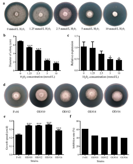 Test of the transformants’ tolerance to H2O2: Fv01 was seeded on a PDA plate containing 5 mmol/L H2O2 using the needle-punching approach, and a PDA plate without H2O2 was used as a control. The crossline method was applied to evaluate the growth rate of the mycelium. The inhibition rate of H2O2 on mycelial growth was calculated as follows: [inhibition rate of mycelial growth = 1 − mycelial growth rate of the experimental group/mycelial growth rate of the control group]. Nine biological repetitions were performed for each strain.