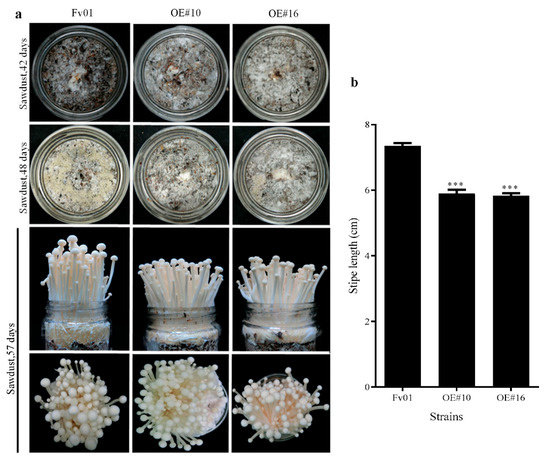 Our previous works suggested that FfGS6 was explicitly expressed on the stipe with the highest level in the elongation period [22]. To examine the role of the FfGS6 gene in modulating fruit body development, two transformants (OE#10, and OE#16) with the most significant overexpression efficiencies were selected for fruiting experiments. Concurrently, the wild-type strain Fv01 served as the control. Morphological differences during fruit body development were recorded. As shown in Figure 6a, the mycelia of the material surfaces of the aforementioned two transformants completely turned white on the 42nd day of cultivation (five days after scratching the fungus), showing markedly stronger repairability than that of Fv01; on the 48th day of cultivation, all strains exhibited primordia formation, but the number of primordia in the two transformants was considerably less than that of Fv01; during fruit body development, the overexpression strains and Fv01 showed no noticeable difference in cap morphology but markedly different stipe elongation rates. Next, the stipe length was measured, and the results are summarized in Figure 6b. On the 57th day of cultivation, the stipe length of Fv01 reached 7.4 cm, while OE#10 and OE#16 had significantly shorter stipes (5.89 and 5.83 cm, respectively). Two overexpression transformants of FfGS6 had the same decreasing trend of stipe. Therefore, the FfGS6 gene meditated several characteristics, such as mycelial recovery ability, primordium number, and stipe elongation, during the fruiting body development of F. filiformis.