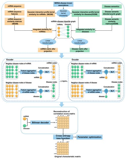 In the present study, the prediction of the potential miRNA–disease associations was mainly used to generate the low-dimensional embedding of node information through the encoder based on a graph neural network, so as to realize the identification of the correlation between miRNA and diseases by a bilinear decoder. Our model can be described in four steps, as shown in Figure 1.