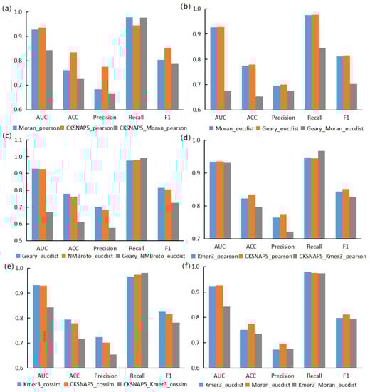 Example diagram of dependence of dual feature models on single feature models. (a) is a comparison between the Pearson correlation coefficient model based on Moran feature (blue), the Pearson correlation coefficient model based on CKSNAP feature (dark orange) and the Pearson correlation coefficient model based on Moran+CKSNAP combined feature (gray). (b) is a comparison between the Euclidean distance model based on Moran feature (blue), the Euclidean distance model based on Geary feature (dark orange) and the Euclidean distance model based on Moran+Geary combined feature (gray). (c) is a comparison between the Euclidean distance model based on Geary feature (blue), the Euclidean distance model based on NMBroto feature (dark orange) and the Euclidean distance model based on Geary+NMBroto combined feature (gray). (d) is a comparison between the Pearson correlation coefficient model based on Kmer feature (blue), the Pearson correlation coefficient model based on CKSNAP feature (dark orange) and the Pearson correlation coefficient model based on Kmer+CKSNAP combined feature (gray). (e) is a comparison between the cosine similarity model based on Kmer feature (blue) and the cosine similarity model based on CKSNAP feature (yellow) and the cosine similarity model based on Kmer+CKSNAP combined feature (gray). (f) is a comparison between the Euclidean distance model based on Kmer feature (blue), the Euclidean distance model based on Moran feature (dark orange) and the Euclidean distance model based on Kmer+Moran combined feature (gray).