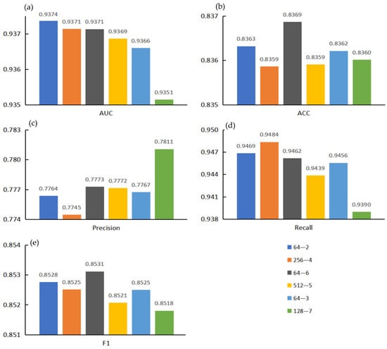 Here, we used the model based on CKSNAP features and the Pearson similarity calculation method to study the influence of projection dimension and encoder layers on prediction performance, changing the number of projection dimensions and encoder layers to obtain the scores of different models on five evaluation indicators. Different projection dimensions will affect the expression ability of nodes. Changing the number of encoder layers can adjust the learning degree of neural networks to node feature information. As can be seen from Figure 5a, with an increase in projection dimensions, the recall rate of the model fluctuated greatly, and the change in F1 score was not obvious. The accuracy score increased significantly with the increase of projection dimensions but dropped sharply when the projection dimension, E, was greater than 256. According to Figure 5b, with an increase in encoder layers, the evaluation indexes of the model showed a downward trend as a whole; especially after L > 6, the indexes of the model declined sharply.