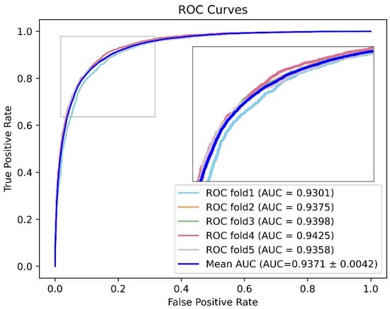 Here, we marked the top five models in each evaluation indicator and screened out the models with two or more markers to obtain the results shown in Figure 6. Considering that Acc was greatly affected by the proportion of positive samples in the sample set, Acc was not taken as the primary evaluation indicator. Precision and recall provide a single view of the performance, whereas F1 score provides a more comprehensive view of the performance and therefore was used for model evaluation. Therefore, considering AUC and F1 score, we noted that the model with project dimensions E = 64 and encoder layer L = 6 had better performance in all aspects. The receiver operating characteristic curve for the 5-fold cross validation experiment is shown in Figure 7. At the same time, the ROC curve of each fold can be seen in Figure S1.