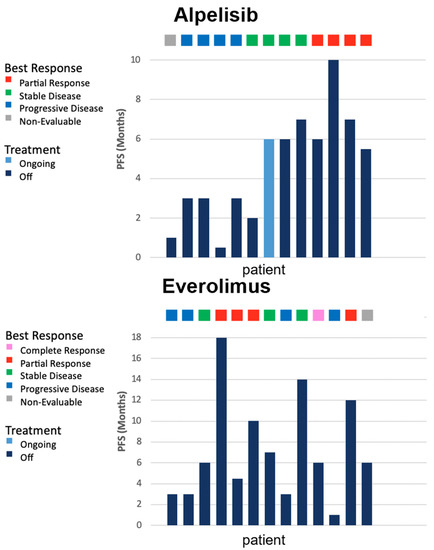Figure 1. Progression-free survival and best response to everolimus and alpelisib. The same patient is represented in both graphs in the same bar location.