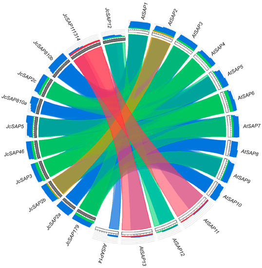 For Gene conservation, duplication events, homology, and Synteny analysis, a comparative Synteny analysis was performed by using circoletto Tool (https://www.tools.bat.infspire.org/circoletto/) (accessed on 2 September 2022) to visualize genome conservation. Protein sequences of Arabidopsis SAP genes were used against the identified JcSAP sequences and were finally exhibited by circus by running the Circoletto tool [27].