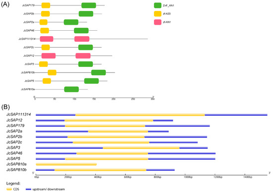 Domain (A) and Gene structure organization (B) of JcSAP genes.