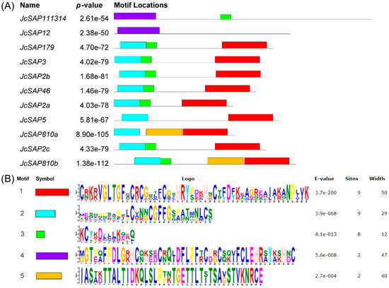 Conserved motifs of JcSAP genes in Jatropha curcas. (A) Identified motifs; (B) logos of the identified motifs.