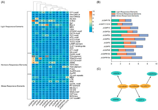 Cis regulatory elements and prediction of miRNA target sites of JcSAP genes. (A) The heat map of the Cis elements and their classification, present in the promoter region of JcSAP genes, (B) Graphical visualization of the groups of Cis elements in the promoter region of JcSAP genes, (C) Predicted miRNA target sites of JcSAP genes.