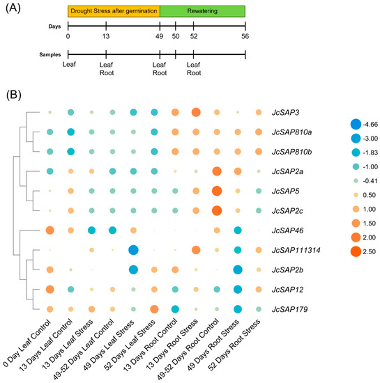 To investigate the possible function of JcSAP genes during environmental abiotic stress in Jatropha, the expression data were analysed from leaf and root tissues of Jatropha plants subjected to drought stress [32] (Figure 7A). The heat map showed the expression level of 11 JcSAP genes in different tissues of leaf and root during drought stress and after recovery (Figure 7B). The results further revealed that JcSAP179, JcSAP3, and JcSAP2b were highly expressed in leaf and in root, followed by JcSAP111314, JcSAP810a, and JcSAP810b as compared with the other JcSAP genes. Contrarily, JcSAP2a, JcSAP5, JcSAP2c were highly expressed in roots only. These results provide the possible involvement of JcSAP genes in abiotic stress tolerance in Jatropha.