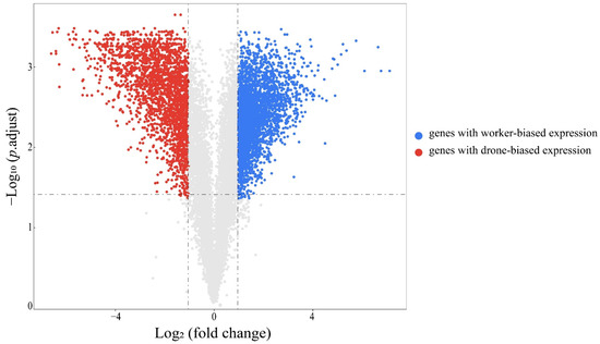A volcano plot showing the differentially expressed genes (adjusted p value < 0.05 and |log2(fold change)| > 1, Benjamini-Hochberg method) between workers and drones. The antennae of both workers and drones included three biological replicates.