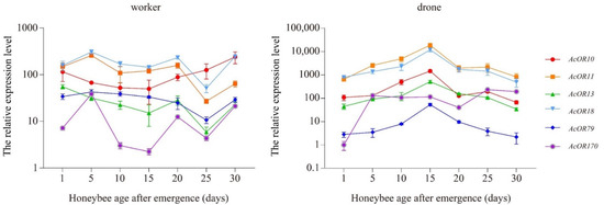 The relative expression level of AcOR10, AcOR11, AcOR13, AcOR18, AcOR79 and AcOR170 in workers and drones of A. cerana of different ages. Data are presented as the means ± standard errors.