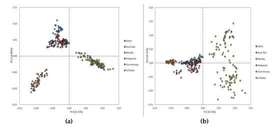 Population structure from the principal component analysis (PCA). PCA plots show the distribution of individuals of Karachai goats in the dimensions of two coordinates, i.e., (a) the first (PC1; X-axis) and second (PC2; Y-axis) principal components, (b) the first (PC1; X-axis) and third (PC3; Y-axis) principal components, with the percentage of total genetic variability, which can be explained by each of the two components, indicated within the parentheses; the individuals from the different herds are indicated by different colors.