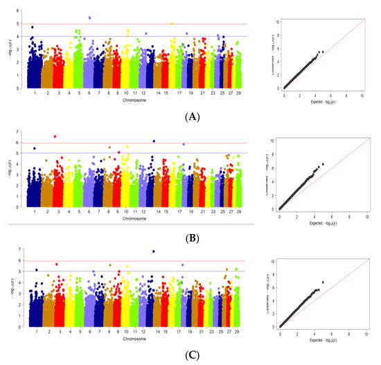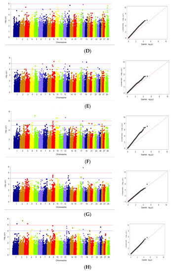 Manhattan plots and quantile–quantile (Q–Q) plots of GWAS for studied traits: (A) body weight; (B) withers height; (C) rump height; (D) body length; (E) chest perimeter; (F) chest width; (G) chest depth; (H) rump width. (Manhattan plots): distribution of single nucleotide mutations in goat chromosomes to the level of significance (−log10 (p) according to the suggestive probabilistic value (blue line, p < 0.0001) and the Bonferroni test (red line, p < 1.05 × 10−6) for the traits; (Q–Q plots): probability distribution quartile of expected and observed deviations from a normal distribution for confidence values. The dots are color-coded to visualize chromosome separation; the color does not carry any other semantic load.