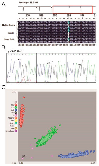 The sequence alignment between the promoter regions of the chicken WNT4 gene in the Hy-line Brown, Jining Bairi and Sunzhi hens showed that the critical promoter region contains an SNP (G > C) at −3015 (Figure 2A). The peak map of polymorphic sites was genotyped using the Chromas software. This polymorphic site has three genotypes (Figure 2B), and the number distribution of the different genotypes is shown in Figure 2C. The number of Jining Bairi population (n = 539) represents the samples which are successfully genotyped. According to the results of KASP, the genotype and allele frequency of this SNP locus were calculated (Table 2). At this SNP site, allele G was predominant in the Jining Bairi chicken population.