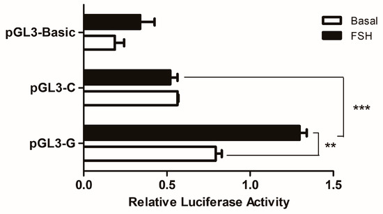 Luciferase reporter constructs of pGL3-G and pGL3-C were transiently transfected into GCs to assess whether the SNP could change the effect of WNT4 gene transcription. As shown in Figure 3, this SNP significantly affected the promoter activity: the promoter with allele G had higher luciferase activity than the promoter with allele C (p < 0.001). After FSH treatment, the luciferase activity of the promoter with allele G was significantly (p < 0.01) increased than before, as well as still significantly (p < 0.01) higher than the activity with allele C.