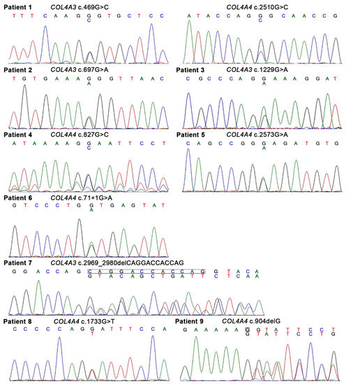 There were 10 heterozygous variants in COL4A3 or COL4A4 in nine patients; among these, eight were single nucleotide variants and two were deletion variants (Figure 1, Table 2). There was a splice-site single nucleotide variant in Patient 6. Patient 1 had digenic variants (COL4A3 c.469G > C and COL4A4 c.2510G > C). Seven different glycine substitutions in the collagenous domain were identified in six patients. The pathogenicity of the 10 variants was examined according to the ACMG guidelines [20] and 5, 3, and 2 of the 10 variants were considered to be “likely pathogenic”, of “uncertain significance”, and “pathogenic”, respectively (Table 2 and Table S3). Three variants (COL4A4 c.2573G > A in Patient 5, COL4A3 c.2969_2980del in Patient 7, and COL4A4 c.904delG in Patient 9) were unreported in the ClinVar database [22] and Leiden Open Variation Database (LOVD) [23] and were considered to be novel variants. The minor allele frequency (MAF) was examined in each single nucleotide polymorphism in the gnomAD and 8.3KJPN databases, and rare variants with “uncertain significance” or “likely pathogenic” were observed in three or one patients, respectively. The three rare variants with “uncertain significance” were “probably damaging” and “deleterious” in PolyPhen-2 and PROVEAN programs, respectively.