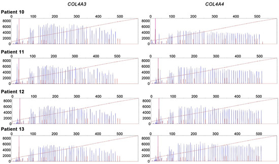 MLPA analyses of COL4A3 and COL4A4 were performed in four patients with no apparent variants on Sanger sequencing, which yielded negative results (Figure 2).