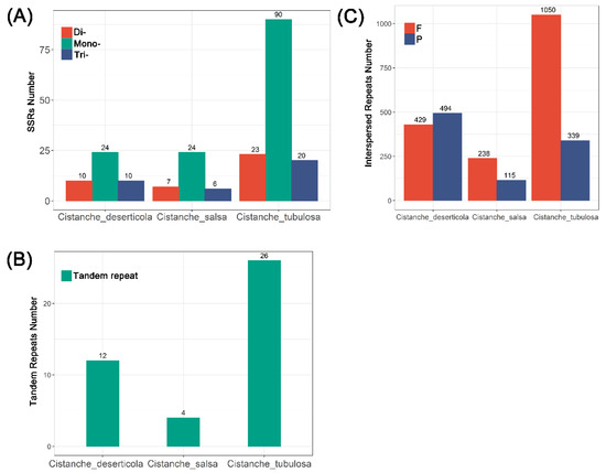 Simple sequence repeats (SSRs), interspersed repeats and tandem repeats in 3 Cistanche species mitogenomes. (A) Comparison of SSRs among the three mitogenomes. Each color column represents a different SSR-repeat type. (B) Comparison of tandem repeats among the three mitogenomes. (C) Comparison of interspersed repeats in the three mitogenomes. Each color column represents a different interspersed-repeat type. The number of repeats in each category is shown on the top of the corresponding columns.