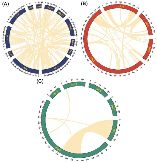 The segment-duplication-identification results showed that the segment sequences ranged from 199,584 bp to 2,142,551 bp in length (Table 1), accounting for 24.9%, 11.7% and 53.9% of the lengths of the C. deserticola, C. salsa and C. tubulosa mitogenomes, respectively (Figure 3). In the C. deserticola mitogenome, 39 alignments were identified. The lengths of the alignments ranged from 5078 bp to 38,025 bp (Table S17). By contrast, only 14 alignments were identified in the C. salsa mitogenome. The lengths of the alignments ranged from 5385 bp to 23,085 bp (Table S18). It is worth noting that 168 alignments were found in the C. tubulosa mitogenome. The lengths of the alignments ranged from 5169 bp to 64,106 bp (Table S19). These repeat sand segment duplications might have promoted genome rearrangement and contributed to the variations in genome size.