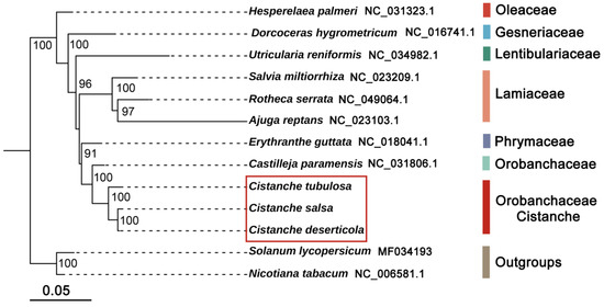 Phylogenetic relationships of Cistanche species with 8 other Lamiales species. The tree was constructed based on the amino-acid sequences of 49 mitochondrial protein-coding genes, including atp1, atp4, atp6, atp8, atp9, atpB, atpE, ccmB, ccmC, ccmFc, ccmFn, cob, cox1, cox2, cox3, cytB, ItrA, matR, mttB, nad1, nad2, nad3, nad4, nad4L, nad5, nad6, nad7, nad9, petG, petL, rbcL, rpl2, rpl5, rpl10, rpl16, rpl23, rpl36, rps1, rps3, rps4, rps7, rps10, rps11, rps12, rps13, rps14, rps19, sdh3 and sdh4. Species in red box were three Cistanche species.