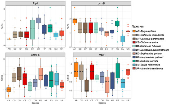 Boxplots of pairwise Ka/Ks values among each retained mitochondrial protein-coding gene within the 11 Lamiales species.