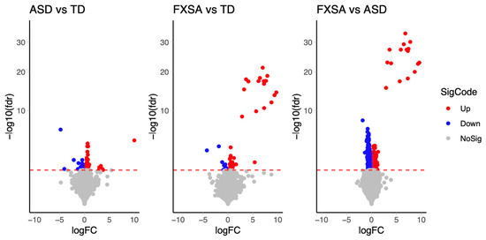 Volcano plot of DMS. Volcano plots for the significant DMS that were identified with adjusted p-value < 0.05 in the three groups comparison, ASD vs. TD, FXSA vs. TD and FXSA vs. ASD, where blue circles indicate significant hypomethylation probes with adj p-value < 0.05 and red circles indicate hypermethylation probes with adj p-value < 0.05.