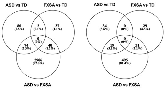 Hence, researchers studying ASD and FXS have started delving deeper into the possible epigenetic mechanisms that might contribute to the clinical phenotypes characterizing children with these disorders. Usually, studies to identify disease-associated epigenetic markers aim at determining the role of an identified biomarkers as diagnostic factors, descriptors, or modulators for the risk and prognosis of the disorder in patients and to elucidate their roles in the pathogenesis of the disorder [50]. In this study, we used an epigenetics approach to obtain a global methylation profile in three groups of children, ASD, FXSA, and TD, matched by age (2–6 years) and gender.