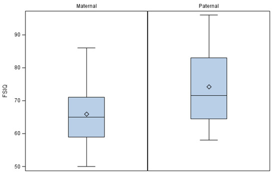 Among the 54 individuals with an inherited 22q11.2 deletion and FSIQ scores, 38 (70.4%) were of maternal and 16 of paternal origin, reflecting the relative paucity of paternally inherited 22q11.2 deletions given differential reproductive fitness effects in affected men [5,23]. Of note, individuals with inherited deletions of maternal origin were found to have a lower median FSIQ than those of paternal origin (65; range 50–86 vs. 71.5; range 58–96, p = 0.0350; Figure 2). Results were similar using the regression model to account for age, sex and cohort site (Table 1). The FSIQ scores of those with maternal inheritance on average were on average approximately 8 points lower than those with paternal inheritance of the chromosome 22q11.2 deletion.