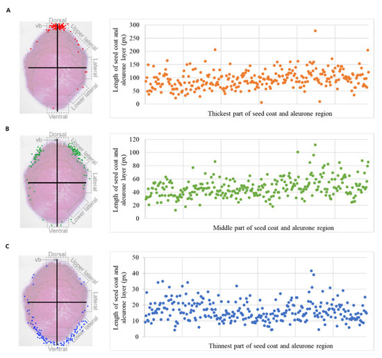 Scatterplot of seed coat and aleurone layer thickness by region, in the 294 rice resources. (A) the thickest part, (B) middle part, and (C) the thinnest part. The cross-section of seeds was classified into a total of five areas (dorsal, upper lateral, lateral, lower lateral, and ventral) according to half-cut seed method and investigated.