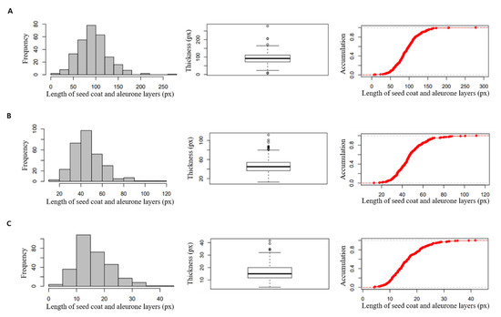 Phenotypic distributions and box plots of seed coat and aleurone layer thickness by region with 294 rice resources. (A) the thickest part, (B) middle part, and (C) the thinnest part.