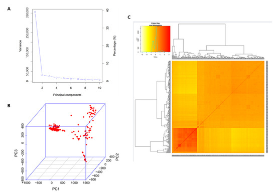 Quality control was performed, to select criteria for selection of specific SNPs related to seed coat and aleurone layers thickness for re-sequencing the data of the 294 rice core collection. Of the total of 6,243,699 SNPs, 1,842,515 (29.5%) SNPs with a read depth of 4× or more and 200× or less, MAF > 0.05, genotyping quality ≥ 20, and Hardy–Weinberg equilibrium (p ≤ 0.001) were confirmed. PCA and kinship analyses were performed for population structure analysis using high-quality 1,842,515 SNPs, with a compressed mixed linear model (CMLM). A 294 rice core collection panel was determined by graphical representation of the K value on a screen plot, which indicated the presence of three sub-populations. This result was confirmed by the variation in the first 10 major components (PCs) showing inflection points in PC2, suggesting that the first two PCs dominated the population structure on the association analysis (Figure 3). The first two PCs were significant and explained 39.65 and 3.7% of the total genetic variation, which suggests the predominance of these three components in controlling the population structure of association panel. A kinship matrix is displayed as a heatmap, where red indicates the highest correlation between pairs of individuals and yellow indicates the lowest correlation. The relatedness of pairwise coefficients estimated in the kinship matrix indicated a lower genetic relatedness among individuals in the association panel.