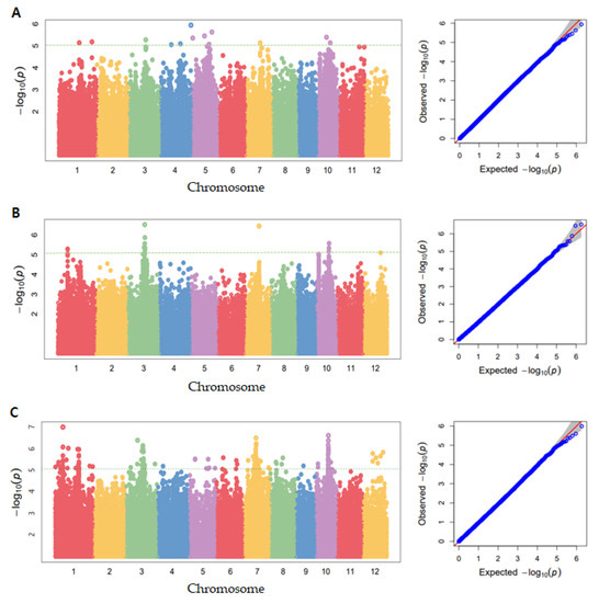 Genome-wide association study of seed coat and aleurone layers by region in the 294 rice core collection. The −log10(p) values from a genome-wide scan are plotted against the position on each of the 12 chromosomes. (A) The thickest part, (B) middle part, and (C) thinnest part.